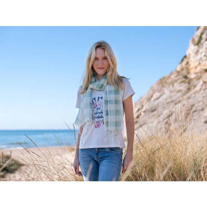 ¡Fluye con la sincronía del universo! Chal natural de color verde, 50% seda y 50% bambú del Himalaya, Nepal. Tintes naturales ozo-free. Superfino, práctico y transpirable. Disponible en verde, marfil y melocotón. Medidas: 70cmx200cm.