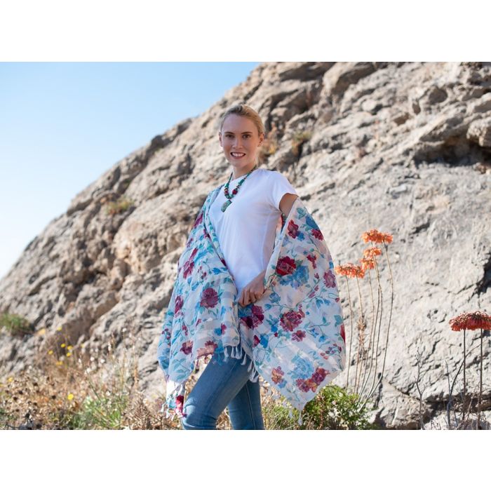 ¡Serás el alma de toda fiesta! Chal fresco, elegante y vaporoso. Hecho en Nepal de forma artesanal con 50% seda y 50% bambú del Himalaya. Estampado con flores de rododendro rojas y azules. Tintes naturales ozo-free. Medidas: 70cmx200cm.