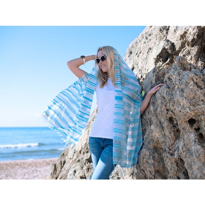 ¡Feliz como una perdiz! Chal natural, fresco y alegre. Elaborado de forma artesanal con 50% seda y 50% bambú del Himalaya, Nepal. Estampado a rayas en azul y blanco, tintes naturales. Medidas: 70cmx200cm.