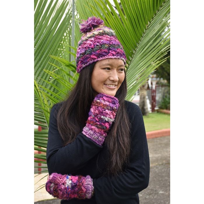 Unisex. Gorro forrado elaborado con 30% sari de seda reciclado y 70% lana del Himalaya, Nepal. El sari es la indumentaria típica de las mujeres y consiste en una colorida pieza de tela sin costuras. Hecho y teñido a mano con tintes naturales. Lo encuentras en colores lila, rojo, azul, negro y marrón. Cálido, artesanal y natural. Talla única.
