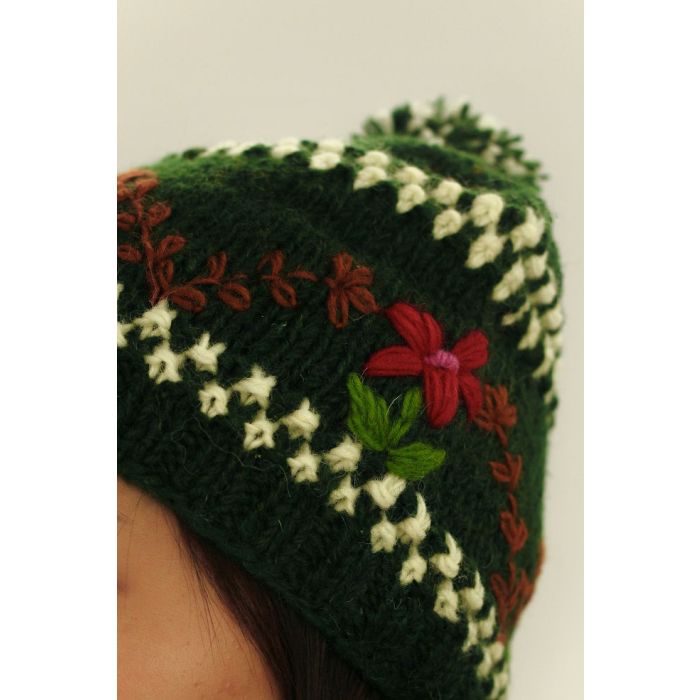 Gorro bordado y hecho a mano por mujeres de comunidades en riesgo de exclusión social en Nepal. Elaborado con 100% lana del Himalaya, Nepal. Disponible en verde y negro. Teñido a mano con tintes naturales. Original, cálido y natural.