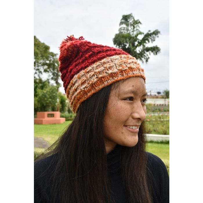 Gorro unisex hecho a mano por mujeres de comunidades en riesgo de exclusión social en Nepal. Elaborado con 100% lana del Himalaya. Disponible en color rojo, azul, marrón y negro, combinado con colores en degradado. Tintes naturales teñidos a mano. Original, cálido y natural. Desde Nepal, nuestro origen. Talla única.